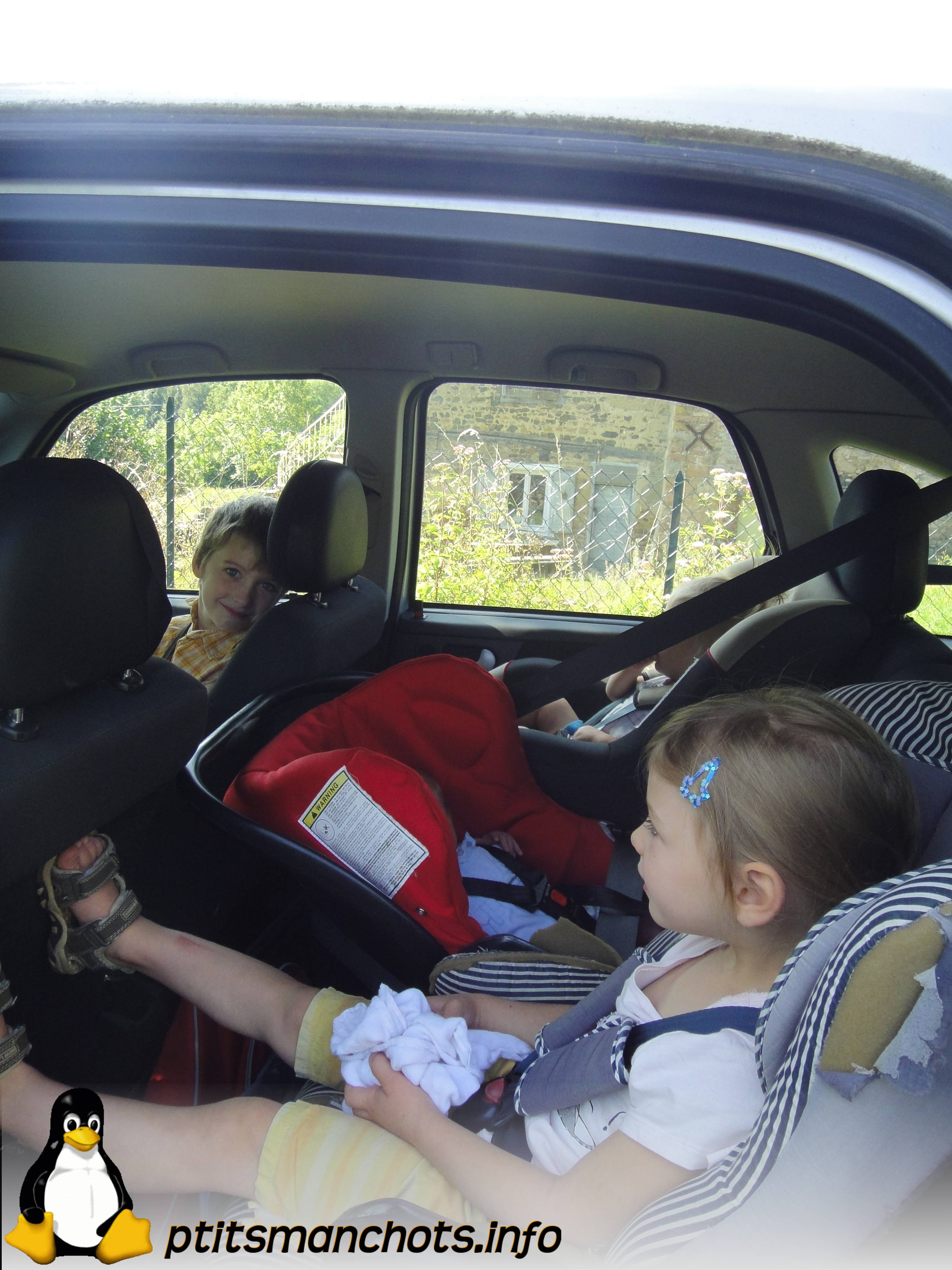 En route pour l’aventure Publié le 14 août 2013 par Myriam Première sortie en voiture, « juste » les 4 et moi… Nous sommes complet ! Test réussi, il faudra juste prévoir un peu de temps en plus pour les trajets à l’école… c’est un peu long d’attacher et de détacher tout le monde !